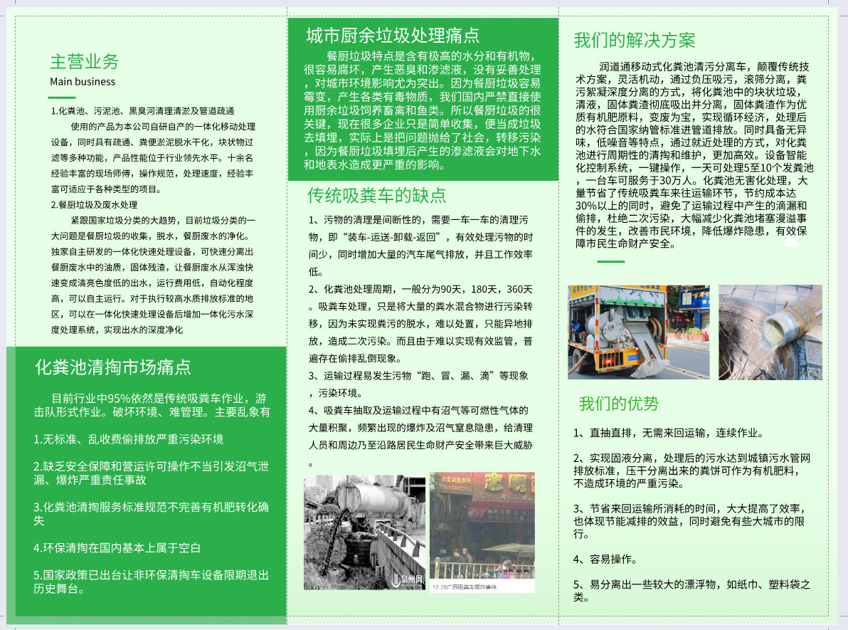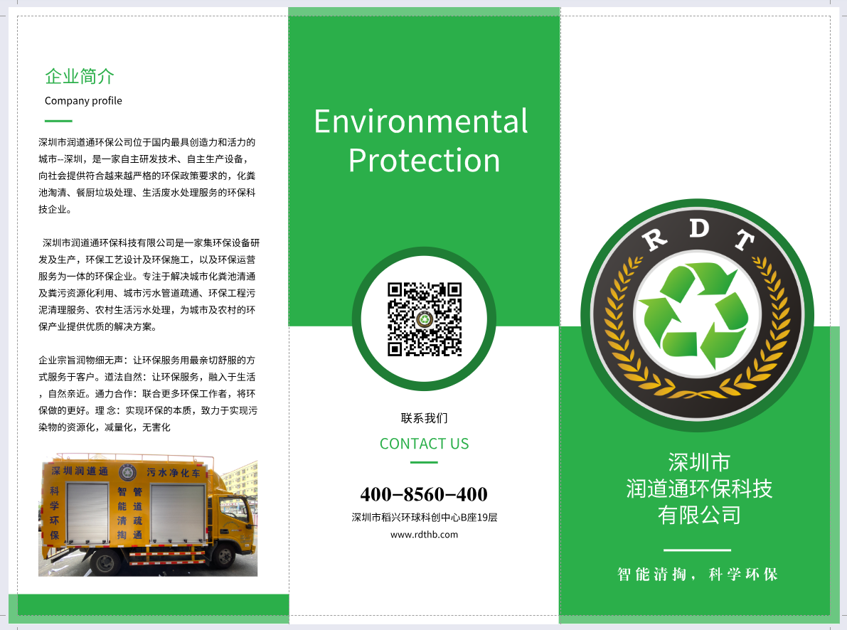 深圳是中国改革开放的窗口,创造了举世瞩目的“深圳速度”。润道通将公司立足于此,充分发挥深圳环保人才以及环保技术的国内领先优势,创造符合高标准要求且实用的环保解决方案,致力于将我们创造的环保新模式,扩展至全国。公司以技术为根本,引进并培养了众多高水平环保及设备工程师,我们在环保行业里,有一份推进环境事业的初心和社会责任感。我们反复思考国内目前出现环保项目投入高、运行难度大、实用性不强的状况,所以我们致力于推行更简单、实用、低投入、好运行的环保方案。 目前在化粪池,餐厨废水的领域,我们通过改进技术方案,设备研发,创造出了源头控制,末端利用,过程易管理的环保模式。大大推动了餐厨废水,化粪池清理等环保领域的发展,并在努力拓展医院废水、农村污水等多个领域的发展。我们希望通过我们的努力,让山更绿,水更清,生活环境更美好。